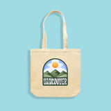 A harvest gold sun rises over luscious green mountains with the word "Vancouver" below in Julie Solvstrom's "Vancouver Blue Sky" MAKE Original Natural Tote